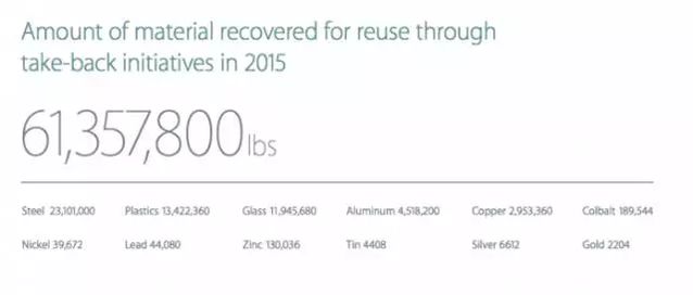 在昨天晚上,蘋果發(fā)布了年度環(huán)保講演,在講演中,蘋果提到,他們從回收項目之中搜集到了大量有用的貴金屬和重金屬,包括鋼鐵、鋁、玻璃以及黃金,總重量高達6100萬鎊,值得一提的是,在這些回收的原材料當中,黃金占到了2204磅(約合999.7公斤),按照黃金回收價格每盎司1229.80美元計算的話,蘋果回收的黃金價值達到了大約4000萬美元,約合人民幣2.6億元。這個數(shù)字仍長短常驚人的。