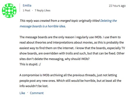 美國時間 2017 年 2 月 3 日,IMDb 公布將于 2017 年 2 月 20 日正式封閉留言板功能(Message Boards),而供用戶進行溝通的私信功能(Private Message)也將隨之下架。 成立于 1990 年,IMDb(Internet Movie Database,互聯網片子數據庫)是國際著名的片子、電視和名人資訊網站,以其“神秘且權勢巨子”的評分機制、龐大齊全的片子電視資料庫著稱。 除了常規(guī)的影視基本資訊外(如上映時間、演員和制作團隊、預報片、作品評論等),在每個影視作品條目下還會包括良多“影迷范兒”十足的用戶出產內容(UGC),如:經典語錄(Quotes)、片子漏洞(Goofs)、冷知識(Trivia)、片子原聲等,是不少深度影迷觀影前后必到“圣地”。 影視作品作為一種可解讀性極強的文本,離不開觀眾對于文本甚至人物的討論,而這一任務則由“留言板”來承載。固然名為“留言板”,但該功能實在就是“論壇”,注冊用戶針對不同條目創(chuàng)建話題,發(fā)起討論。除了每個影視作品、人物條目下都會配備留言板以外,IMDb 還設置了 47 個主要討論版塊,并有超過600 萬注冊用戶使用過留言板的功能。 (圖自 Reddit) 據聲明,本次對留言板功能的撤銷是經由了“仔細考慮,且基于數據和流量”作出的決定,并宣稱,用戶現已逐漸將討論轉移到 IMDb 的其它官方社交賬號上,如 Facebook、 Twitter、Tumblr 等,原“留言板已不再為全球每月 2.5 億全球用戶提供積極、有用的體驗”。 在 IMDb 的討論區(qū)中,動靜一宣布,不少用戶都跟帖表示對該決定的反對,并以為社交賬號并不可替換原留言板的功能。