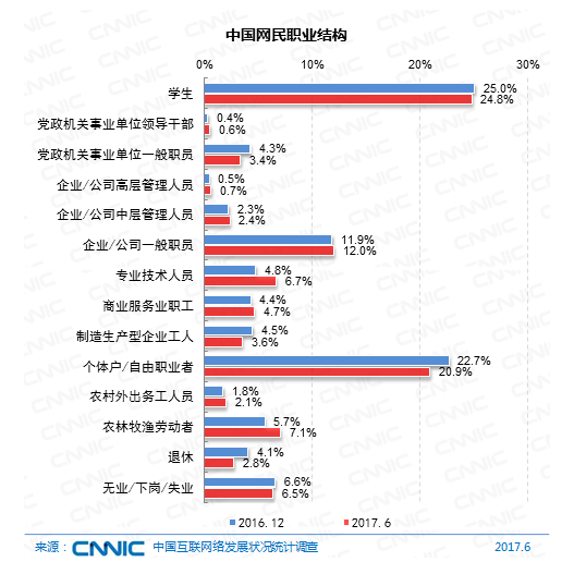 在工作結構上,我國網(wǎng)民中學生集體占比依然最高,為24.8%;其次為個體戶/自由工作者,份額為20.9%;企業(yè)/公司的管理人員和一般職工占比算計到達15.1%。