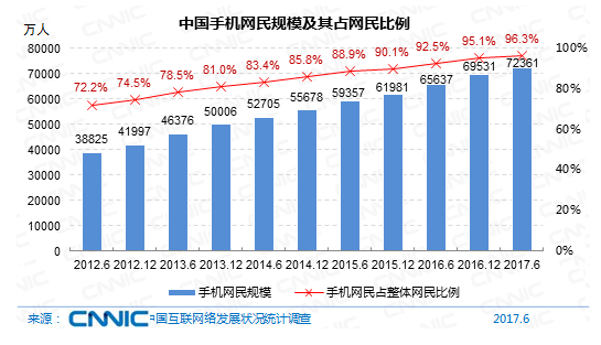 到2017年6月,我國手機網(wǎng)民規(guī)劃達7.24億,較2016年末添加2830萬人。網(wǎng)民運用手機上網(wǎng)的份額由2016年末的95.1%提高至96.3%。
