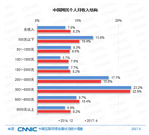 在收入結構上,網(wǎng)民中月收入在2001-3000元及3001-5000元的集體占比較高,別離為15.8%和22.9%。較2016年末,收入在5000元以上的網(wǎng)民人群占比提高了2.1個百分點。