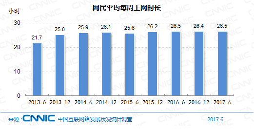 2017年上半年,我國網(wǎng)民的人均周上網(wǎng)時長為26.5小時,與2016年根本相等。