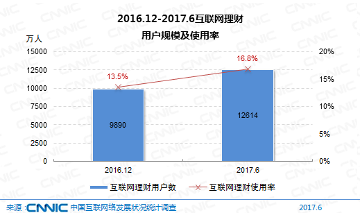 到2017年6月,我國購買互聯(lián)網(wǎng)理財產(chǎn)品的網(wǎng)民規(guī)劃到達1.26億,較2016年末添加用戶2724萬人,網(wǎng)民運用率從13.5%升至16.8%。