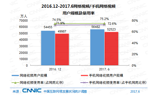 到2017年6月,我國網(wǎng)絡視頻用戶規(guī)劃達5.65億,較2016年末添加2026萬人,添加率為3.7%;網(wǎng)絡視頻用戶運用率為75.2%,較2016年末提高0.7個百分點。其間,手機視頻用戶規(guī)劃為5.25億,與2016年末比較添加2536萬人,添加率為5.1%;手機網(wǎng)絡視頻運用率為72.6%,比較2016年末添加0.7個百分點。