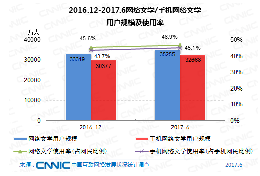 到2017年6月,網(wǎng)絡文學用戶規(guī)劃到達3.53億,較去年末添加1936萬,占網(wǎng)民全體的46.9%,其間手機網(wǎng)絡文學用戶規(guī)劃為3.27億,較去年末添加2291萬,占手機網(wǎng)民的45.1%。
