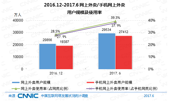到2017年6月,我國網(wǎng)上外賣用戶規(guī)劃到達2.95億,較2016年末添加8678萬,添加率到達41.6%。其間,我國手機網(wǎng)上外賣用戶規(guī)劃到達2.74億,添加率為41.4%,運用份額到達37.9%,提高10個百分點。