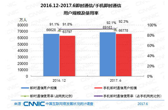到2017年6月,即時通訊用戶規(guī)劃到達6.92億,較2016年末添加2535萬,占網(wǎng)民全體的92.1%。其間手機即時通訊用戶6.68億,較2016年末添加2981萬,占手機網(wǎng)民的92.3%。