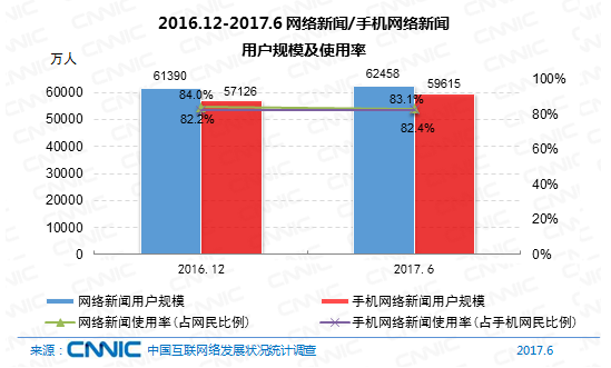 到2017年6月,我國網(wǎng)絡新聞用戶規(guī)劃為6.25億,半年添加率為1.7%,網(wǎng)民運用份額為83.1%。其間,手機網(wǎng)絡新聞用戶規(guī)劃到達5.96億,占手機網(wǎng)民的82.4%,半年添加率為4.4%。