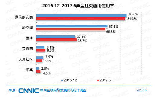 到2017年6月,運用率排名前三的交際運用均歸于綜合類交際運用。微信朋友圈、QQ空間用戶運用率別離為84.3%和65.8%;微博用戶運用率繼續(xù)回升,達38.7%,較2016年12月上升1.6個百分點。筆直類交際運用中,豆瓣用戶運用率為8.6%。