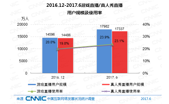 別的值得注意的是,到2017年6月,網(wǎng)絡直播用戶共3.43億,占網(wǎng)民全體的45.6%;而到2016年12月,網(wǎng)絡直播用戶規(guī)劃到達3.44億,占網(wǎng)民全體的47.1%。與半年前比較,網(wǎng)絡直播的用戶規(guī)劃和在網(wǎng)民中的全體占比皆呈現(xiàn)下降。