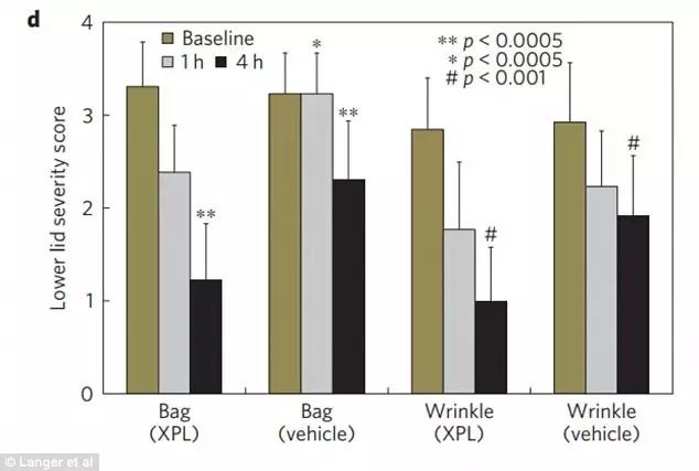 (圖8、還防水喲) 據(jù)研究職員表示,薄膜能在皮膚上施展很好的保護(hù)作用,減少水分流失,有望用于治療濕疹等皮膚病! 假如加入防曬霜成分,這種薄膜還可能起到防曬作用! 對(duì)了,由于聚硅氧烷對(duì)可見(jiàn)光沒(méi)有顯著的吸收,厚度僅40至70微米,所以…… 它不但看起來(lái)基本和正常皮膚沒(méi)太大差別,而且還能消除眼袋和皺紋! 下面是科學(xué)家做的一組對(duì)比實(shí)驗(yàn)數(shù)據(jù),戴上它1小時(shí)和4小時(shí)后,眼袋和皺紋都有顯著的減少。!