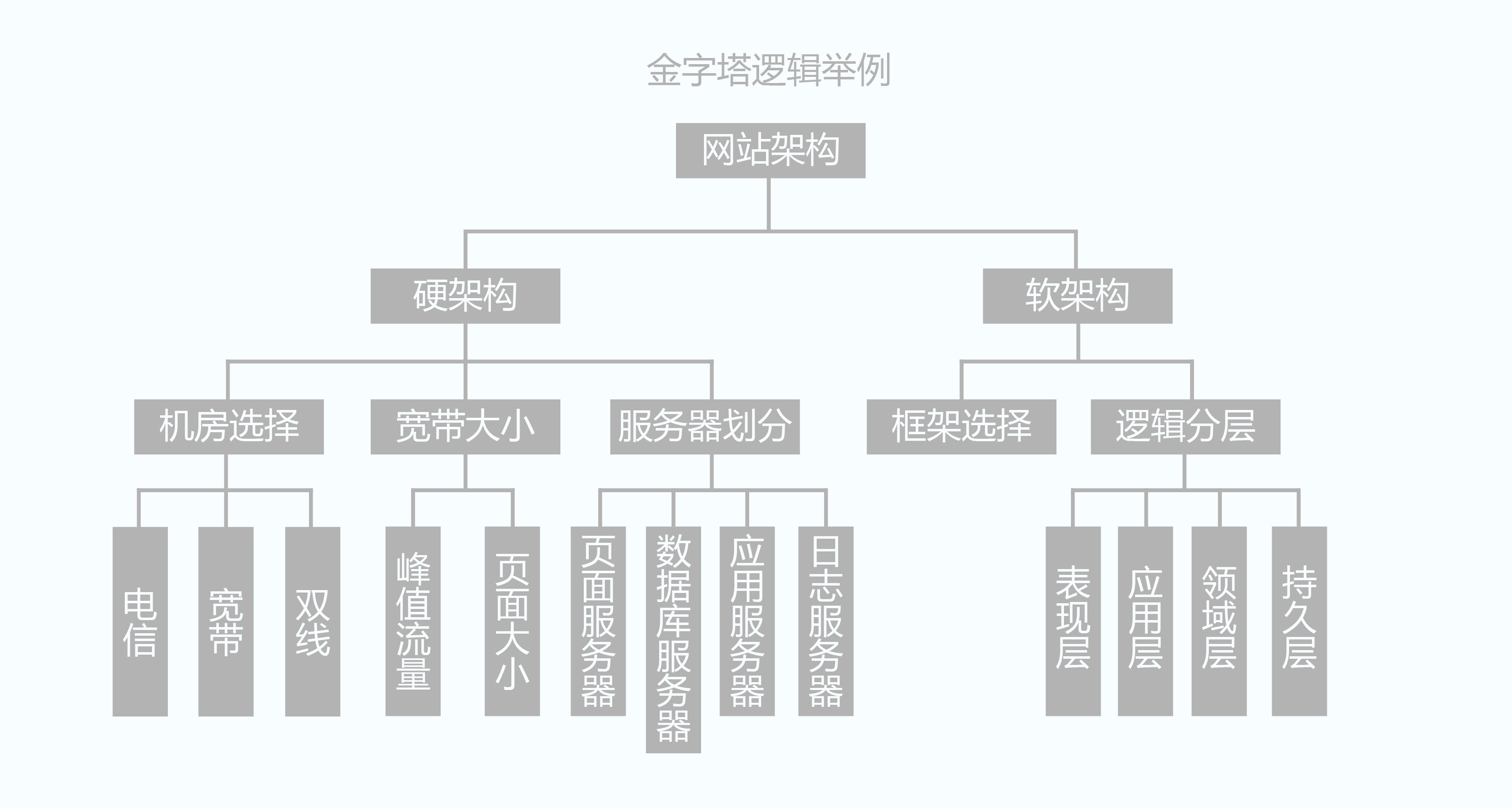 直線式邏輯思路明確,針對(duì)性強(qiáng),輕易看懂,我們引導(dǎo)用戶順著這個(gè)邏輯看設(shè)計(jì)也不會(huì)思路攪渾。 3.金字塔式邏輯 金字塔式邏輯,結(jié)構(gòu)中的各種分類以僅有的幾種邏輯方式互相聯(lián)系(向上、向下和橫向),構(gòu)成相互聯(lián)系緊密且通暢的邏輯思路。金字塔邏輯運(yùn)用廣泛,例如網(wǎng)站架構(gòu)