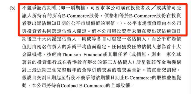 圖4 那么360和酷派的“認(rèn)沽權(quán)”是怎么劃定的呢?可以看出,假如雙方劃定了兩種方式“不競(jìng)爭(zhēng)認(rèn)購(gòu)期權(quán)”和“不競(jìng)爭(zhēng)認(rèn)沽期權(quán)”(圖5),并且分別劃定了相應(yīng)的權(quán)利和義務(wù)(圖6-圖8),尤其是圖7,非常具體的劃定了假如違背“不競(jìng)爭(zhēng)認(rèn)沽期權(quán)”的內(nèi)容,即酷派不得直接或間接于中國(guó)或美國(guó)“在與受限制業(yè)務(wù)相同或相似或與之競(jìng)爭(zhēng)的任何業(yè)務(wù)中擁有任何權(quán)益、治理、控制、介入、咨詢(xún)、提供服務(wù)或以其他方式從事,或從事協(xié)助”,而眾所周知的是,2015年6月28日,酷派發(fā)布的《控股股東出售股份公告》顯示,郭德英家族通過(guò)信托計(jì)劃持股的Data Dreamland以3.508港元每股的對(duì)價(jià)向樂(lè)視聯(lián)系關(guān)系公司出售7.8038億股,占已發(fā)行總股本的18%,后者曾經(jīng)推出了多款手機(jī)產(chǎn)品,與360、酷派合資的奇酷科技的業(yè)務(wù)線重疊嚴(yán)峻,顯然,酷派這是演了一出“一女嫁二夫”的小算盤(pán),但是卻健忘了當(dāng)初與360簽署的協(xié)議,以及必需履行的義務(wù)。