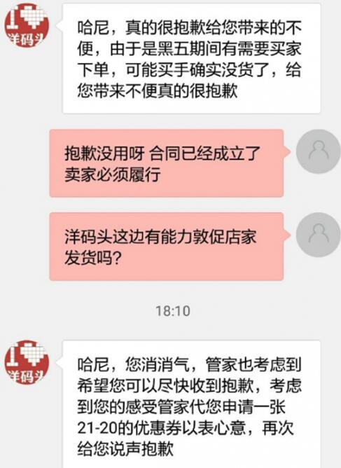 陳同學(xué)以為,買賣雙方合同已經(jīng)形成,并不是賣家說沒貨就能取消發(fā)貨的,立即拒絕了洋碼頭客服的優(yōu)惠券并請洋碼頭督促賣家發(fā)貨。 盡管有洋碼頭平臺客服參與,但賣家仍遲遲未發(fā)貨。在與洋碼頭客服進行在線溝通以及電話溝通后,12月3日洋碼頭方面向陳同學(xué)報歉,因為陳同學(xué)所搶購的Kenzo虎頭衫為限量款,賣家沒有存貨,于是將其市場價格1500元補償給了陳同學(xué)。 1元搶購衛(wèi)衣成功賣家卻不發(fā)貨,最后洋碼頭補償了陳同學(xué)1500元。從11月25日到12月3日,由于一件衛(wèi)衣,陳同學(xué)與賣家、洋碼頭多方溝通,耗時8天,拿到1500元補償后的陳同學(xué)隨后將這筆錢捐給了“但愿工程一對一助學(xué)”。 賣家拒不發(fā)貨并不是個案 維權(quán)期間,陳同學(xué)在自己的個人微博具體記實著事件的進展。很快他發(fā)現(xiàn),在今年的“玄色禮拜五”購物期間,有不少的網(wǎng)友都與他有著相同的遭遇。 據(jù)陳同學(xué)先容,有一位網(wǎng)友表示,自己同樣遭遇了搶購成功但賣家不發(fā)貨的情況。賣家甚至以“無貨”為由,要求買家取消訂單。 ![]()