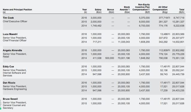 蘋果公司舉例想證實App Store在iPhone銷量下滑的情況下,應用銷售在特定地區(qū)是增長的,新游戲推動了應用銷售增長,以及用戶適應訂閱模式愿意長期支付用度。 App Store等服務業(yè)務帶來的營收是蘋果公司上一年財報中未幾的亮點,也是蘋果公司高管一直夸大重點發(fā)展的業(yè)務,即便App Store營收目前還無法撐起iPhone等硬件銷售下滑帶來的負面影響,不外增速老是讓人滿足的,并且App Store營收相稱于純收入,這些都是可以直接計入利潤的。 蘋果公司表示自2008年App Store面世以來,開發(fā)者已經(jīng)獲得了超過600億美元收入,推導可知蘋果公司獲得257億美元的收入,這都是現(xiàn)金流,直接晉升利潤,股東天然滿足。 蘋果公司高管現(xiàn)金激勵減少 但他們收入主要部門是期權 蘋果公司高管接受總薪酬減少的動靜,是SEC文件表露而恰好泛起,這是高管們對蘋果公司總營收下滑負責的一種表現(xiàn)方式,但假如仔細研究高管們的總薪酬,大家就會明白,高管們薪酬減少的絕對值并未幾,這是由于高管們和普通員工薪酬構成的不同。 對于美國的科技公司員工來說,薪酬包括基本薪酬(年薪)、年終獎金以及期權,在年薪固定或每年微漲、期權按工作時間兌現(xiàn)的情況下,年終獎金會影響到總薪酬的多寡。媒體報道中不僅僅是庫克總薪酬減少,蘋果高管們的薪酬同樣受到影響,均勻整體下滑10.5%。在2016年之前的4年,由于蘋果公司年年增長的業(yè)績,蘋果的高管是獲得最高額的現(xiàn)金激勵的,2016年蘋果公司的總營收和盈利都不如預期,這也影響到蘋果公司高管們的錢包,但是數(shù)據(jù)列出來后,大家就會發(fā)現(xiàn)高管們總薪酬減少的數(shù)額并未幾——對于他們2000萬美元的總薪酬來說,對于普通員工這當然是一大筆錢了。高管們薪酬的大頭是期權,而普通員工比較正視現(xiàn)金獎勵,由于期權總數(shù)有限。 詳細到蘋果公司CEO庫克,他的2016年總薪酬為870萬美元,比2015年的1030萬美元減少160萬美元,而這是他基本薪酬從200萬美元增加到300萬美元的基礎上,所以庫克今年拿得手的現(xiàn)金獎金比去年減少263萬美元。 SEC(美國證券交易委員會)表露的蘋果公司文件顯示,蘋果公司CEO Tim Cook(蒂姆·庫克)2014財年薪酬總額為922萬美元,是其2013財年薪酬(430萬美元)的2.1倍,其中包括工資174萬美元,非股權激勵薪酬670萬美元。研究每年詳細的數(shù)據(jù)可知庫克每年的基本薪酬是在增長的,分別從2014年的174萬美元,2015年的200萬美元到2016年的300萬美元,確定庫克基本薪酬的就是蘋果公司薪酬委員會,這個委員會也決定所有其他高管的薪酬。 對于高管來說,總薪酬比去年降低也不是良多,由于期權獎勵是同樣的。他們總薪酬中的大頭恰是期權獎勵。
