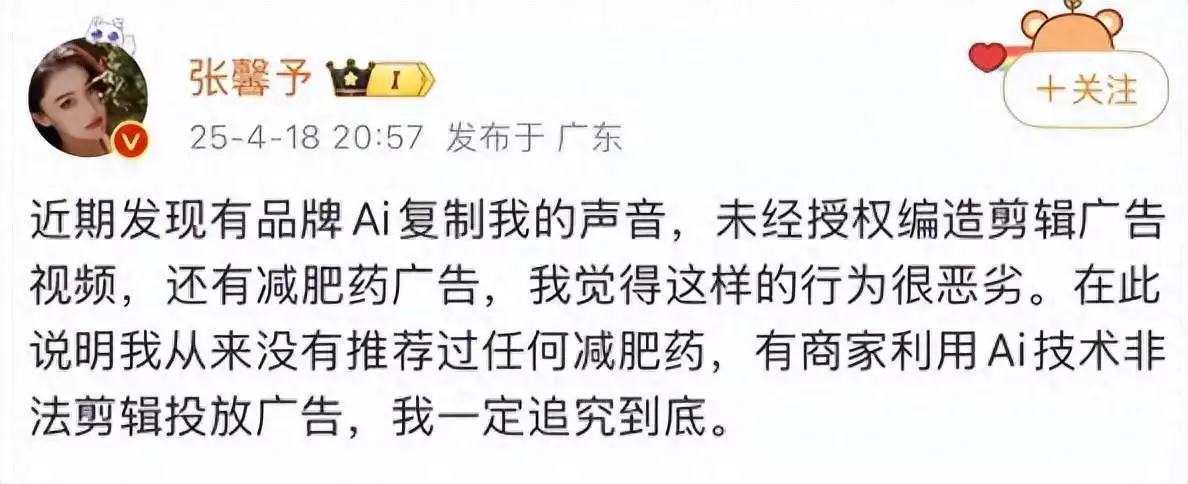 “近期發(fā)現(xiàn)有品牌用AI復(fù)制我的聲音,未經(jīng)授權(quán)編造剪輯廣告視頻,還有減肥藥廣告,我覺得這樣的行為很惡劣。在此說明我從來(lái)沒有推薦過任何減肥藥,