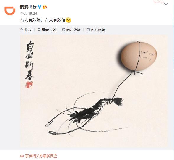 6月11日晚間,@滴滴出行 官方微博發(fā)布了一則很奇怪的微博,文字稱“有人真敢編,有人真敢信”,并且配上了一個摳鼻的表情,和一張“蝦扯蛋”的圖片。