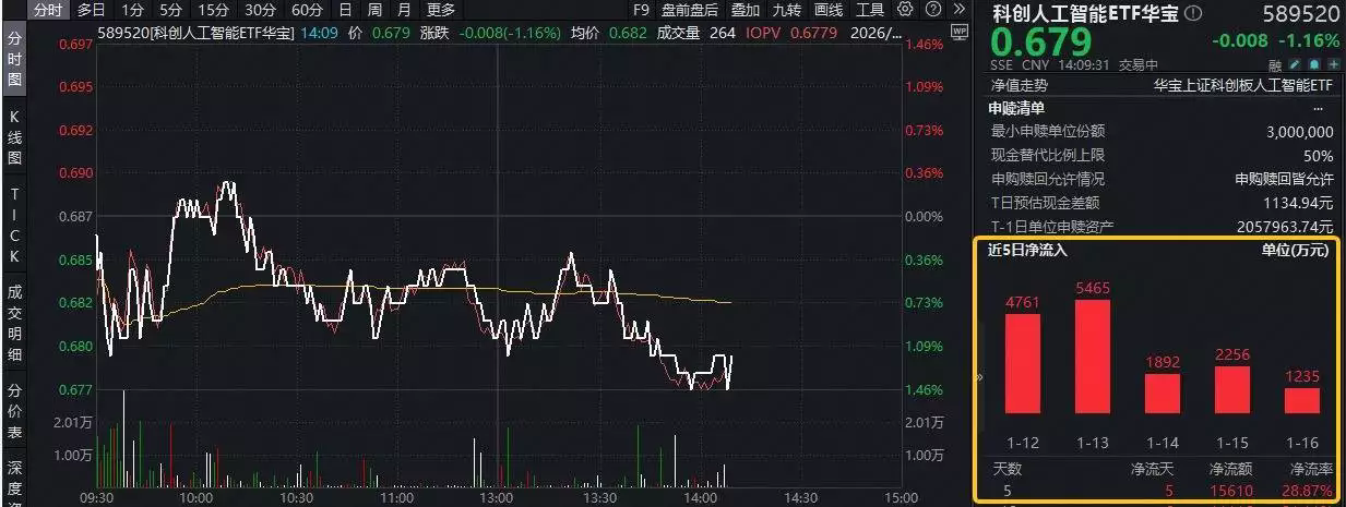 今日(1月19日)要點布局國產(chǎn)AI工業(yè)鏈的科創(chuàng)人工智能ETF華寶隨市盤整回調,場內價格現(xiàn)跌1.16%,數(shù)據(jù)顯示,該ETF此前5日連續(xù)吸金,